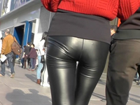 街拍紧身黑色皮裤苗条女生与男友逛街!怎么会有这么美丽的臀部呢
