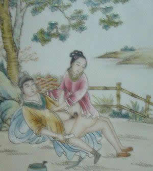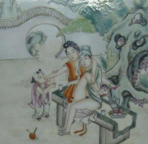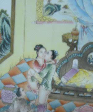 "素女"指房中术《素女经》。将春宫画与小姐观看的习惯,在中国古典文学中也有描写。唐代诗人白行简《天地阴阳交欢大乐赋》就说到《素女经》画册。清代李渔《肉蒲团》中的未央生,为了陶养一位如泥朔木雕、毫无生趣的绝色女子,"到书画铺买幅绝精绝巧的春宫册子,是本朝学士赵子昂的手笔,共有三十六套,唐诗上三十六宫都是春色的意思,拿去放在闺阁之中,好与玉香小姐共同翻阅。"可见在中国古代,春宫图的作用之一是作为进行性教育的媒介。除此以外,春宫图还作为"避火图"、"护书"和"嫁妆画"在民间大量流行。明、清两代,天津杨柳青等地的一些妇女每年春节前将春宫画当做年画销售,这就是有名的"女儿春"。